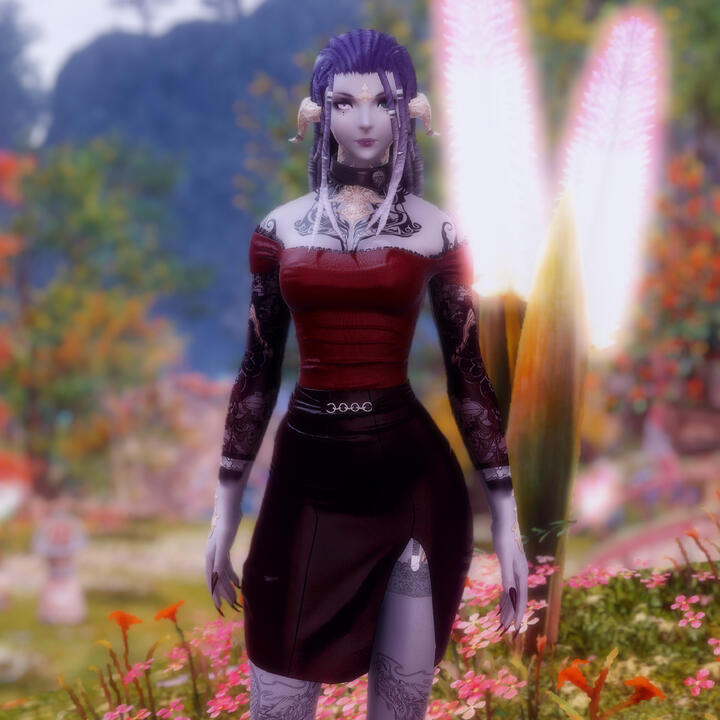 Elly, aka the goth kitten, is a Keeper of the Moon Miqote with split red and black dyed wavy locks. She's often found in graveyards cleaning up graves and headstones and swapping out flowers as a show of respect for the dead. She's happily taken by Spector.Available for sfw posing only.
