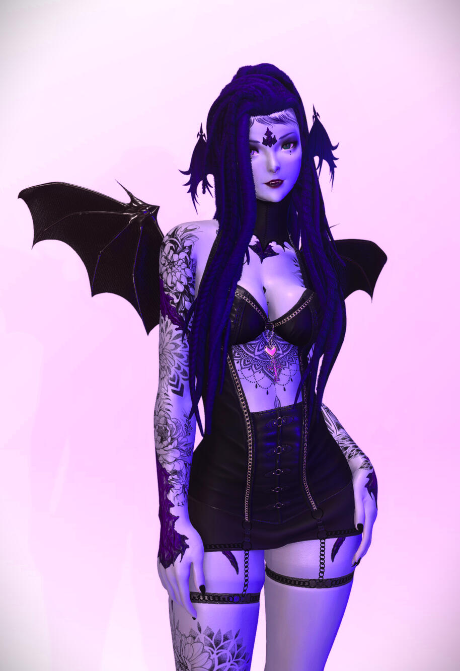 Otherwise known as the Bat Queen, Tati is a female raen with vibrant purple scales, lavender skin, and carved bat wing horns. She's the co-owner, promoter, and goth/industrial DJ of The Veil.Available for sfw and nsfw posing.