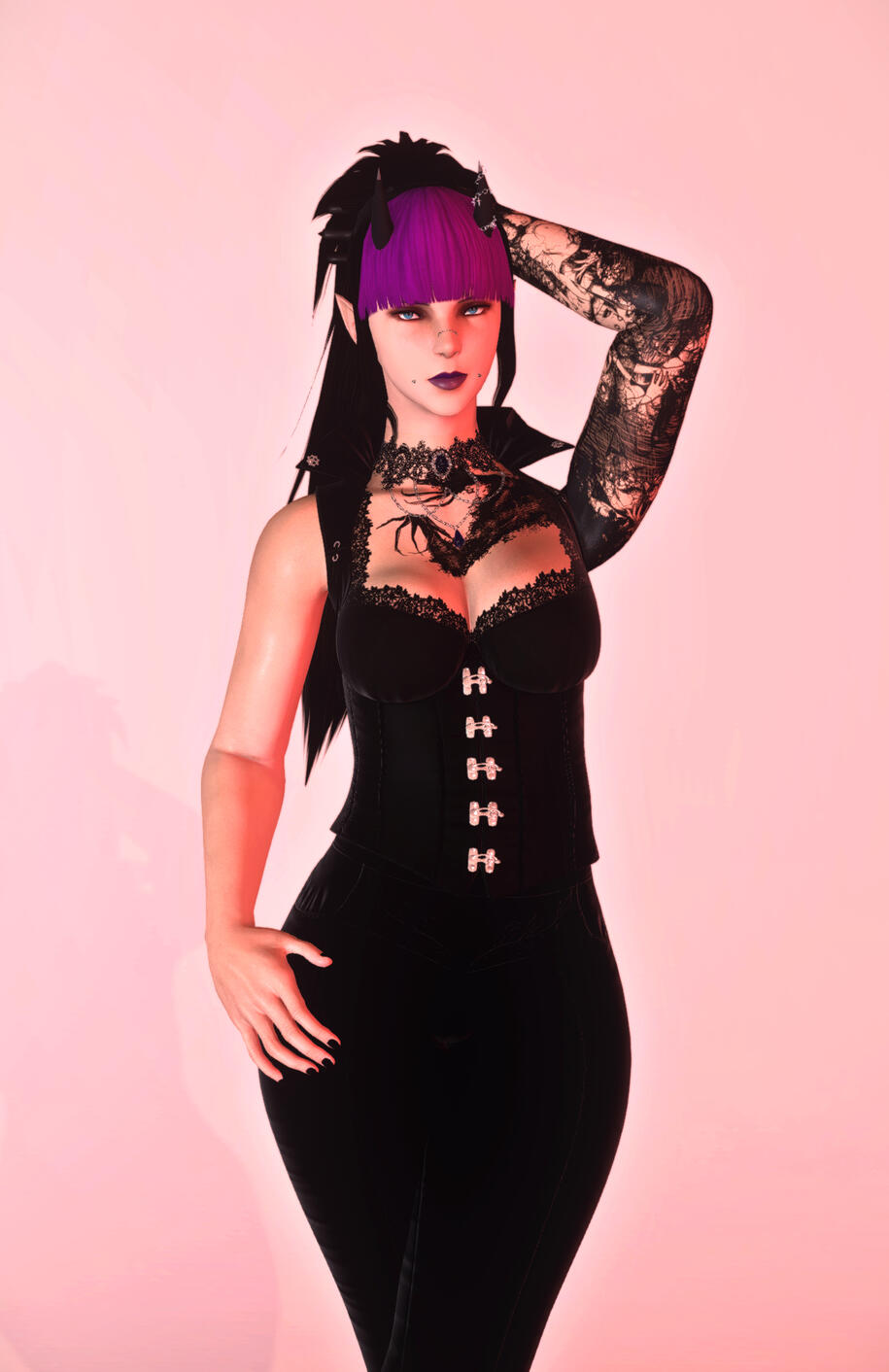 Gwen is a gothabilly female highlander with oni horns and dark spooky tattoos. She may look intimidating, but she's rather nice, especially if you buy her a drink.Available for sfw and nsfw posing.